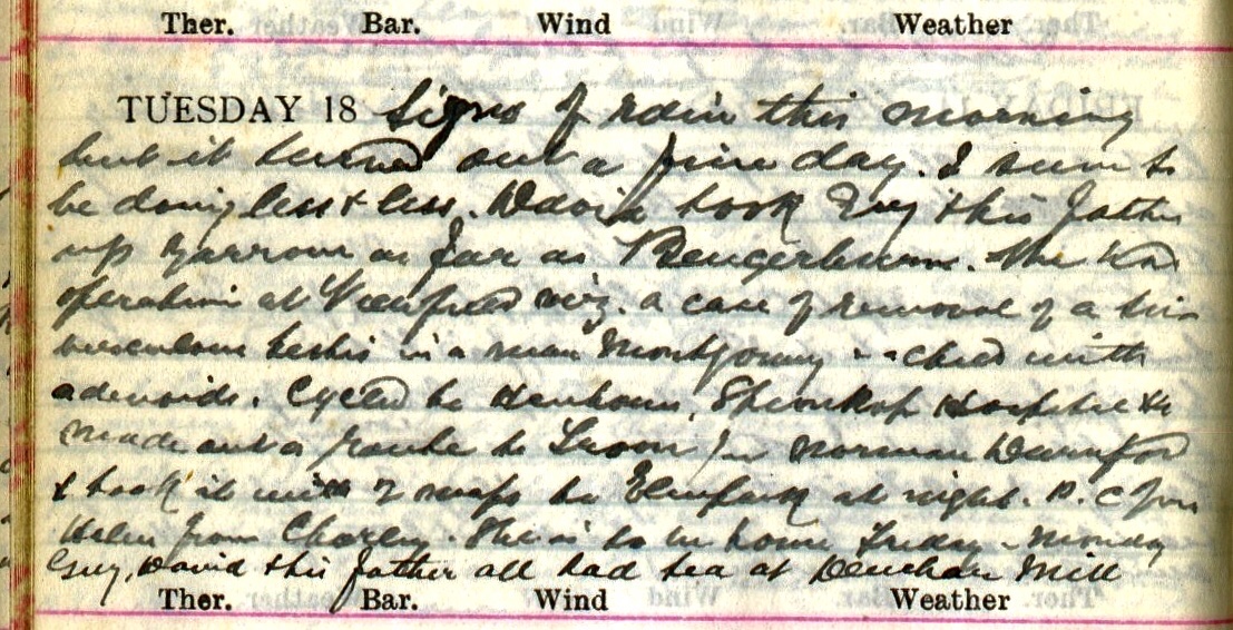 Signs of rain this morning but it turned out a fine day. I seem to be doing less + less. David1 took Guy2 + his father3 up Yarrow as far as Bengerburn. We had operation at Viewfield viz. a case of removal of a tuberculous testis in a man Montgomery4 + a child with adenoids. Cycled to Henhouse, Spionkop5, Hospital +c. Made out a route from Troon for Norman Durnford6 + took it with 2 maps to Elmpark7 at night. P.C. [post card] from Helen8 from Chorley. She is to be home Friday – Monday. Guy, David + his father all had tea at Deuchar Mill.