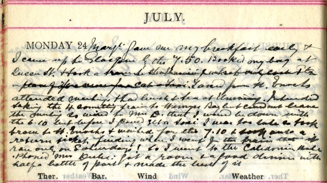 Margt1 gave me my breakfast early + I came up to Glasgow by the 7.50. Booked my bag at Queen Street. + took a tram to [illegible word] which only cost 1½d instead of 3/6 or more for a cab or taxi. Taxied [?] from St Enoch’s, attended meetings2 + had lunch + tea at University3 [?]. Intended taking the 4 something to Wemyss Bay but could not leave the meeting so wired to Mrs D4 that I would be down with the 6.10 but before I could get a taxi I was too late so took train to St Enoch’s + waited for the 7.10 + took [illegible] a return ticket finding when I went for the train that it ran only on Saturdays! So I went to the Caledonian Hotel. ‘Phoned Mrs Dubs: got a room + a good dinner with half a bottle of port + made the best of it.