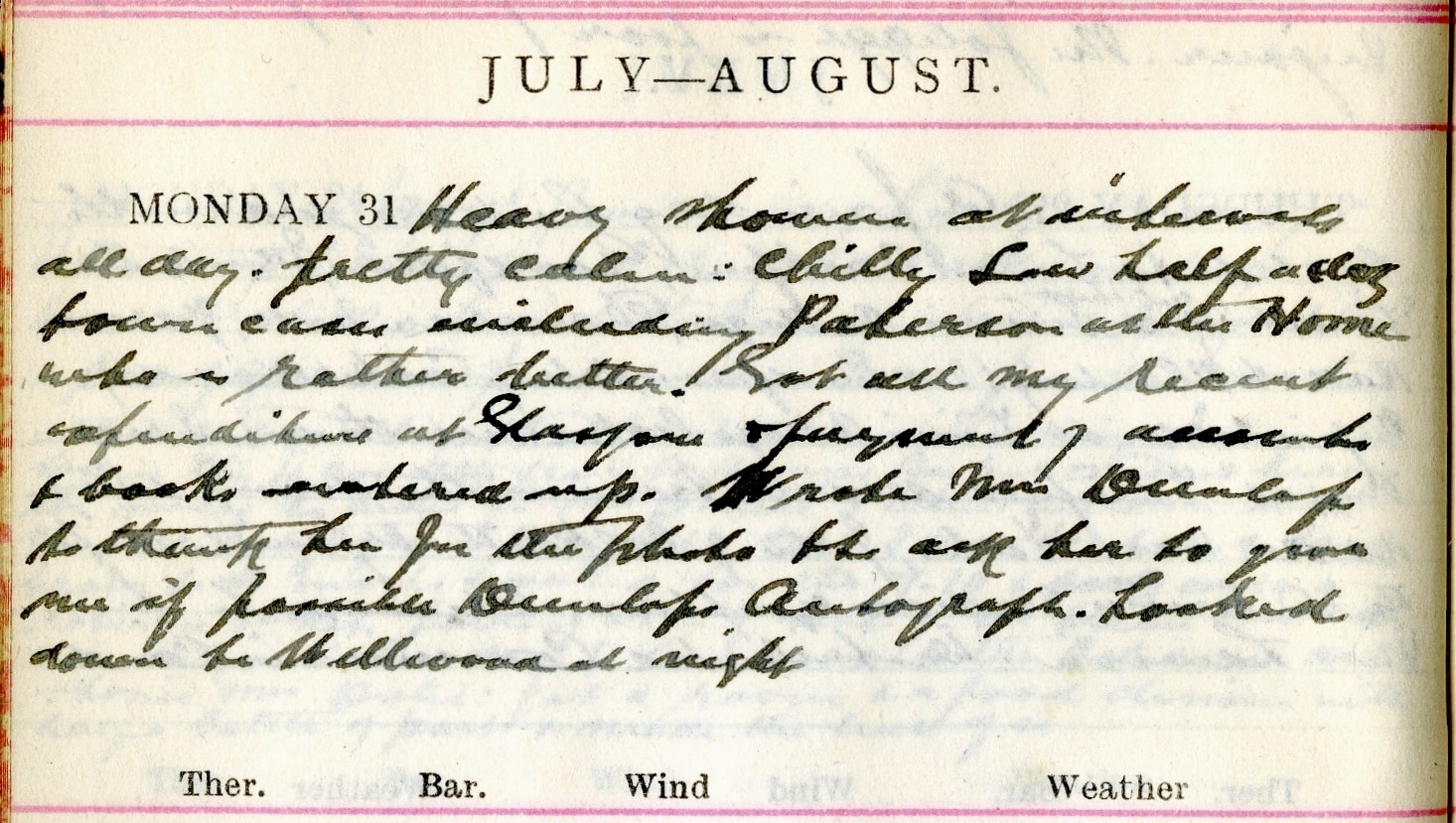 Heavy showers at intervals all day. Pretty calm: chilly. Saw half a doz. town cases including Paterson at the Home who is rather better1. Got all my recent expenditure at Glasgow2 + payment of accounts + books entered up. Wrote Mrs Dunlop3 to thank her for the photo + to ask her to give me if possible Dunlop’s autograph4. Looked down to Wellwood at night.