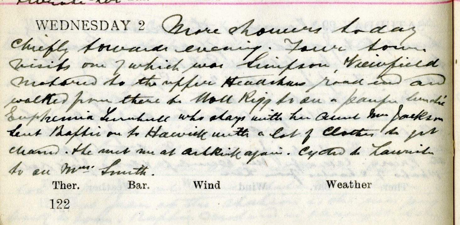More showers today chiefly towards evening. Four town visits one of which was Simpson, Viewfield1. Motored to the Upper Headshaw road end and walked down there to Woll Rigg2 to see a pauper lunatic Euphemia Turnbull3 who stays with her aunt Mrs Jackson4. Sent Baptie5 on to Hawick with a lot of clothes to get cleaned + he met me at Selkirk again. Cycled to Lauriston to see Mrs Smith6.