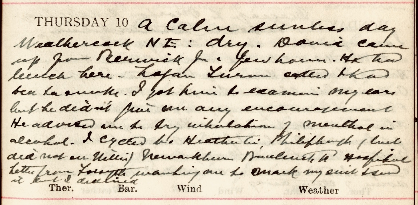 A calm sunless day. Weathercock N.E. : dry. David1 came up from Berwick for a few hours. He had lunch here. Logan Turner2 called + had tea + a smoke. I got him to examine my ears but he didn’t give me any encouragement. He advised me to try inhalation of menthol in alcohol. I cycled to Heatherlie, Philiphaugh (but did not see Willie3), Newarkburn, Buccleuch Road [and] Hospital. Letter from Forsyth4 wanting me to mark my suit + send it but I declined.