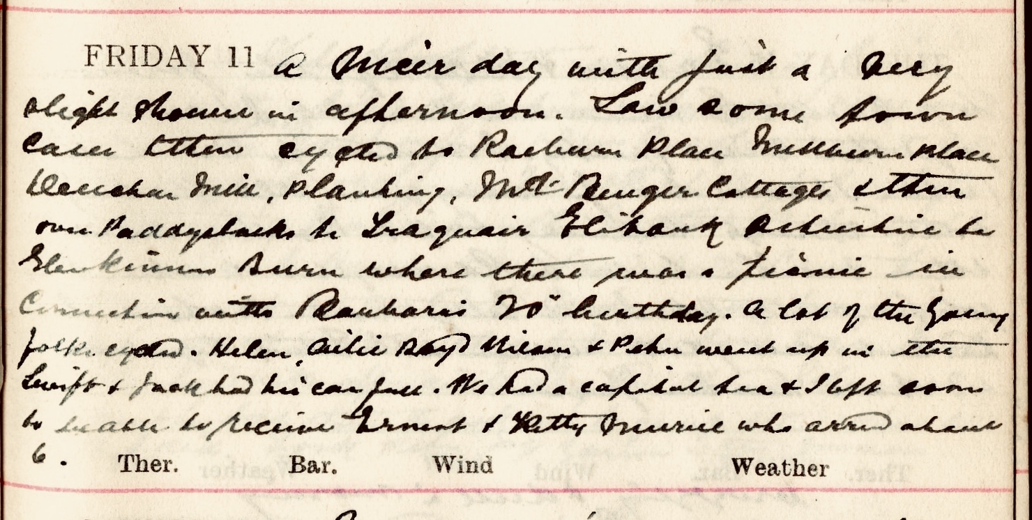 A nicer day with just a very slight shower in afternoon. Saw some town cases then cycled to Raeburn Place, Millburn Place, Deuchar Mill, Planting1, Mt Benger Cottages + then over Paddyslacks [sic]2 to Traquair, Elibank, Ashiestiel to Glenkinnon Burn3 where there was a picnic in Connection with Barbara’s 20th birthday4. A lot of the young folk cycled. Helen5, Ailie Boyd Wilson6 + Peter7 went up in the Swift8 + Jack9 had his car full. We had a capital tea + I left to be able to receive Ernest + Kitty Muriel10 who arrived about 6.