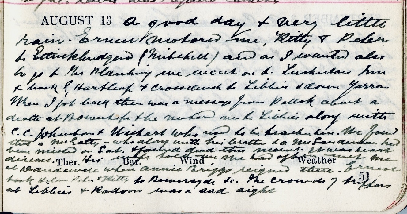 A good day + very little rain. Ernest motored me, Kitty1 + Peter2 to Ettrickbridgend (Mitchell3) and as I wanted also to go to the Planting4 we went on to Tushielaw Inn + back by Hartleap + Crosscleuch to Tibbie’s + down Yarrow. When I got back there was a message from Pollok5 about a death at Bowerhope6 + he motored me to Tibbies with C.C. Johnstone7 + Wishart who used to be teacher here8. We found that a Mr Gatty9 – who along with his brother + a Mr Sanderson10 – had been missed on Saturday + found dead this [? moment]. It was heart disease. His wife11 told me she had often met me at Dandswall when Annie Briggs12 reigned there. Ernest took Helen13, Peter + Kitty to Bemersyde +c. The crowds of trippers at Tibbies + Rodono was a sad sight.