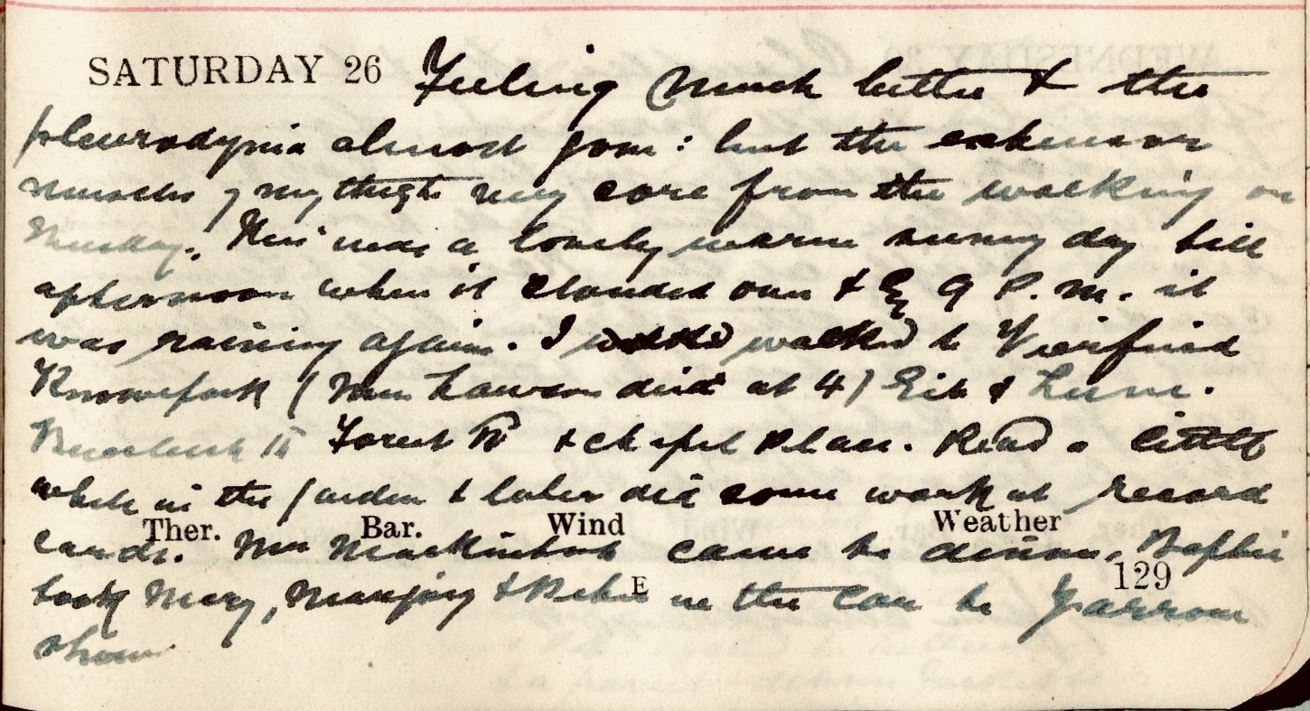 Felt much better + the pleurodynia almost gone : but the exterior muscles of my thigh very sore from the walking on Thursday1. This was a lovely warm sunny day till afternoon when it clouded over + by 9 p.m. it was raining again. I walked walked to Viewfield, Knowepark (Mrs Lawson died at 42), Gib. + Lum.3, Buccleuch Road, Forest Road + Chapel Place. Read a little while in the garden + later did some work at record cards. Mrs Mackintosh4 came to dinner. Baptie5 took Mary, Marjory6 + Peter7 in the car to Yarrow Show8.
