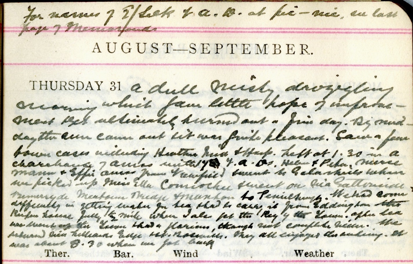 A dull drizzling morning which gave little hope of improvement + yet ultimately turned out a fine day. By midday the sun came out + it was quite pleasant. Saw a few town cases including Heather Mill + Hospital. Left at 1.30 in a charabanc of Amos1 with 17 V.A.D.s2, Helen3 + Peter4, nurse Mann5 + Effie Amos6 from Viewfield + went to Galashiels where we picked up Miss Ella Connochie7 + went on via Gattonside, Bemersyde, Mertoun Bridge + Maxton to Penielheugh8. We had some difficulty getting water for tea + had to carry it from Eddington9 [sic] the keeper’s cottage fully ½ mile where I also got the key of the tower. After tea we went up the Tower + had a glorious though not complete vista. We returned via Lilliard’s Edge + St. Boswells. They all enjoyed the outing. It was about 8.30 when we got back.