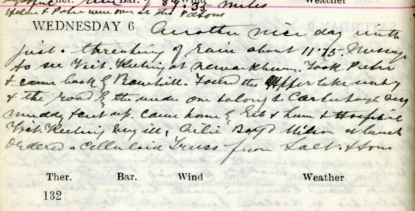 Another nice day with just a threatening [?] of rain about 11.15. Message to see Vict. Keeling1 at Newarkburn. Took Peter + came back by Bowhill. Found the upper lake entry + the road by the under one2 + along to Carterhaugh3 very muddy + cut up. Came home by Gib. + Lum.4 + Hospital. Vict. Keeling very ill. Ailie Boyd Wilson5 at lunch. Ordered a Celluloid Truss from Salt + Sons.6