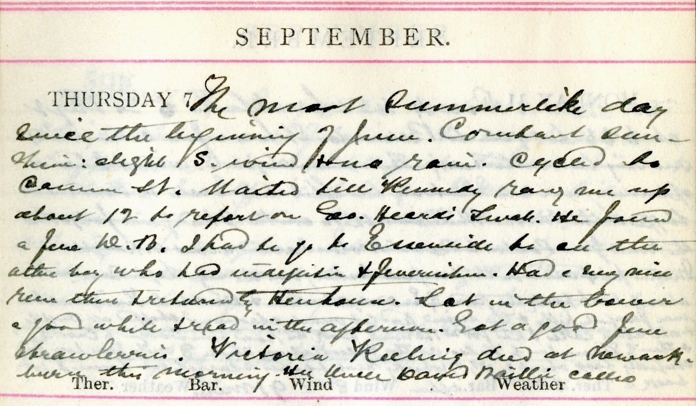 The most summerlike day since the beginning of June. Constant sunshine: slight S. wind + no rain. Cycled to Cannon Street. Waited till Kennedy1 rang me up about 12 to report on Geo. Heard’s Swab.2 He found a few D.B.3 I had to go to Essenside to see the other boy4 who had indigestion + feverishness. Had a very nice run there + returned by Henhouse. Sat in the bower a good while + read in the afternoon. Got a good few strawberries. Victoria Keeling5 died at Newarkburn this morning. Her uncle David Baillie6 called.
