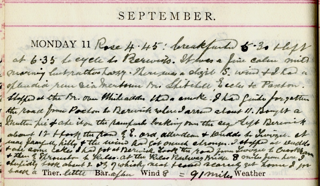 Rose 4.45 : breakfasted 5.30 + left at 6.35 to cycle to Berwick. It was a fine calm mild morning but rather hazy. There was a slight S. wind + I had a splendid run via Mertoun Bri[dge], Stitchill, Eccles to Paxton.1 Stopped at the Bridge over Whiteadder2 + had a smoke. I had quite forgotten the road from Paxton to Berwick where I arrived about 11. Bought a Mutton pie + ate it on the ramparts looking over the sea. Left Berwick about 12 + took the road by E Ord, Allerdean + Duddo to Twizel.3 It was painfully hilly + the wind had got much stronger. I stopped at Duddo + ate some cakes I had got at Berwick. Took the road from Twizel to Crookham + then by Sprouston4 to Kelso. At the Kelso Railway Bridge5 about 8 miles from here I stupidly took about 2oz of whisky neat + I could scarcely get home6. I got back a little after 8. = 91 miles.