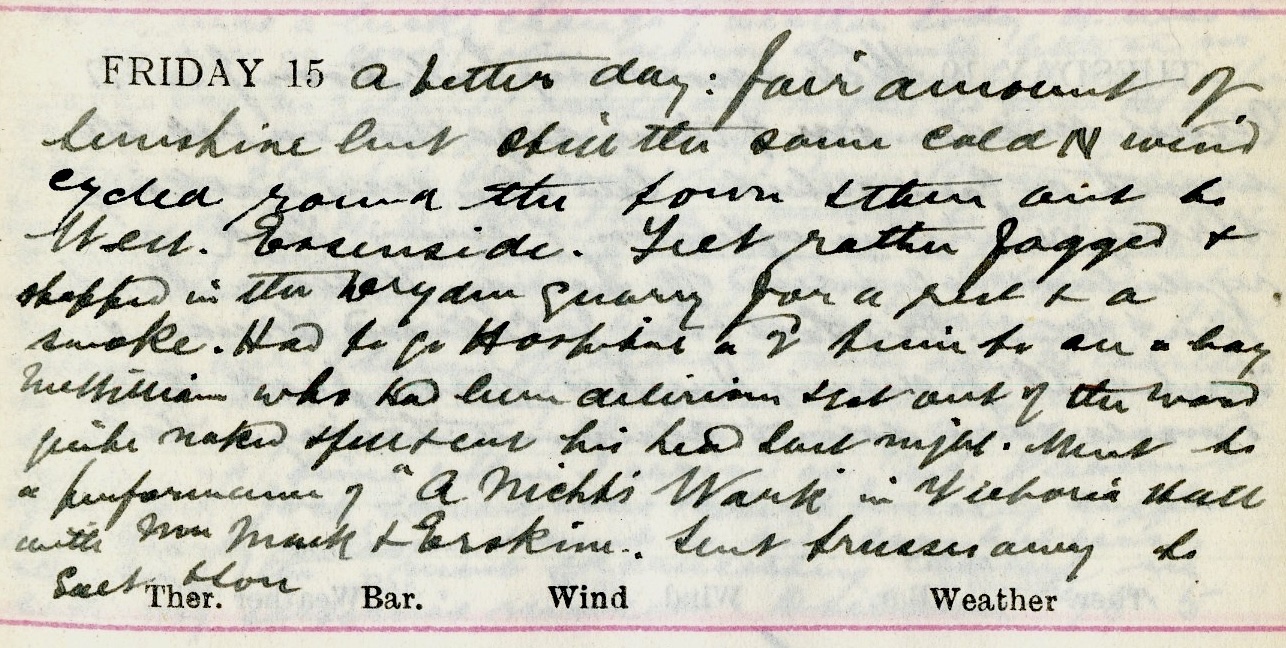 A better day : fair amount of sunshine but still the same cold N. wind. Cycled round the town + then out to West Essenside.1 Felt rather fagged + stopped in the Dryden quarry2 for a rest + a smoke. Had to go [to] Hospital a 2 time to see a boy McWilliam who had been delirious + got out of the ward quite naked + cut his head.3 Went to a performance of ‘A Nicht’s Wark’ in Victoria Hall4 with Mrs Mack5 + Erskine6. Sent truss away to Salt + Son.7