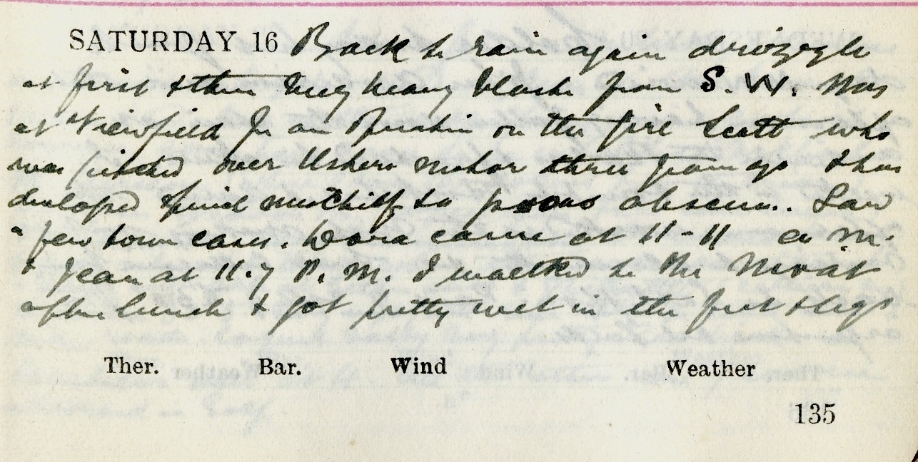 Back to rain again, drizzle at first + then very heavy blasts from S.W. Was at Viewfield for an operation on the girl Scott1 who was pitched over Usher’s motor three years ago2 + has developed spinal mischief + a psoas3 abscess. Saw a few town cases. Dora came at 11.11 a.m. [and] Jean at 11.7 p.m.4 I walked to the Moat5 after lunch + got pretty wet in the feet + legs.