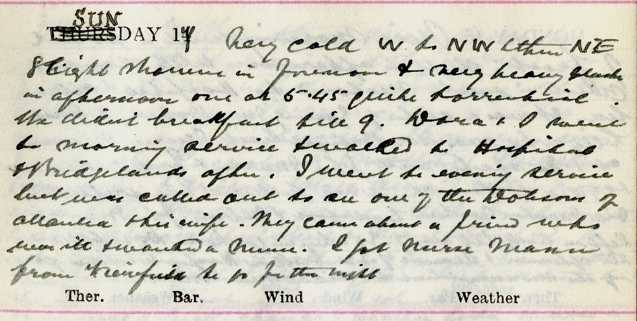 Very cold W. to N.W. + then N.E. Slight showers in forenoon + very heavy blasts in afternoon, one at 5.45 quite horrendous. We didn’t breakfast till 9. Dora1 + I went to morning service + walked to Hospital + Bridgelands after. I went to evening service but was called out to see one of the Dobsons of Allanlea + his wife2. They came about a friend who was ill + wanted a nurse. I got Nurse Mann3 from Viewfield to go for the night.