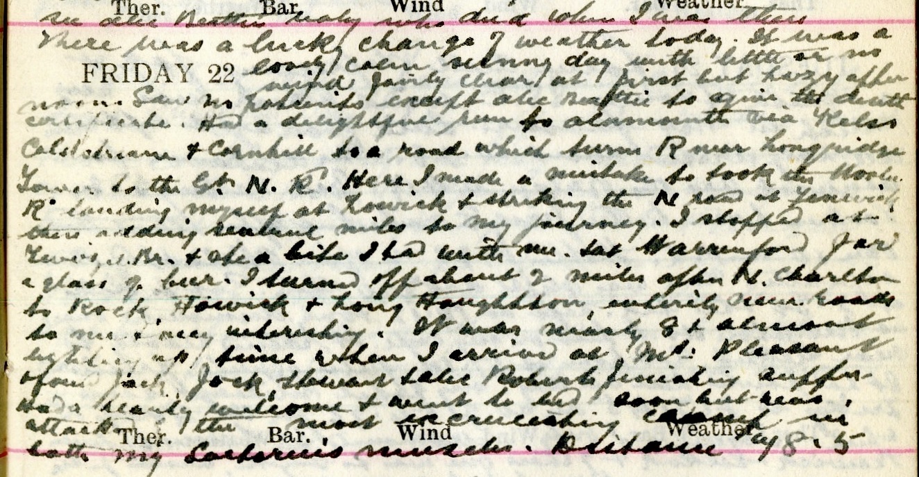 There was a lucky change of weather today. It was a lovely calm sunny day with little or no wind. Fairly clear at first but hazy after noon. Saw no patients except Alec. Beattie to give the death certificate.1 Had a delightful run to Alnmouth via Kelso, Coldstream + Cornhill to a road which turns R. near Longridge Tower2 to the Gt. N. Rd. Here I made a mistake + took the Wooler Rd 3 landing myself at Lowick + striking the N. road at Fenwick, thus adding several miles to my journey.4 I stopped at Twizel Bridge5 + ate a bite I had with me. + at Warrenford for a glass of beer. I turned off about 2 miles after N. Charlton to Rock, Howick + Long Haughton, entirely new roads to me + very interesting. It was nearly 8 + almost lighting-up time when I arrived at Mt Pleasant6 + found Jack, Jock, Stewart7 + Alec Roberts8 finishing supper. Had a heart welcome + went to bed soon but was attacked by the most excruciating cramp in both my Sartorius muscles.9 Distance 78.5.