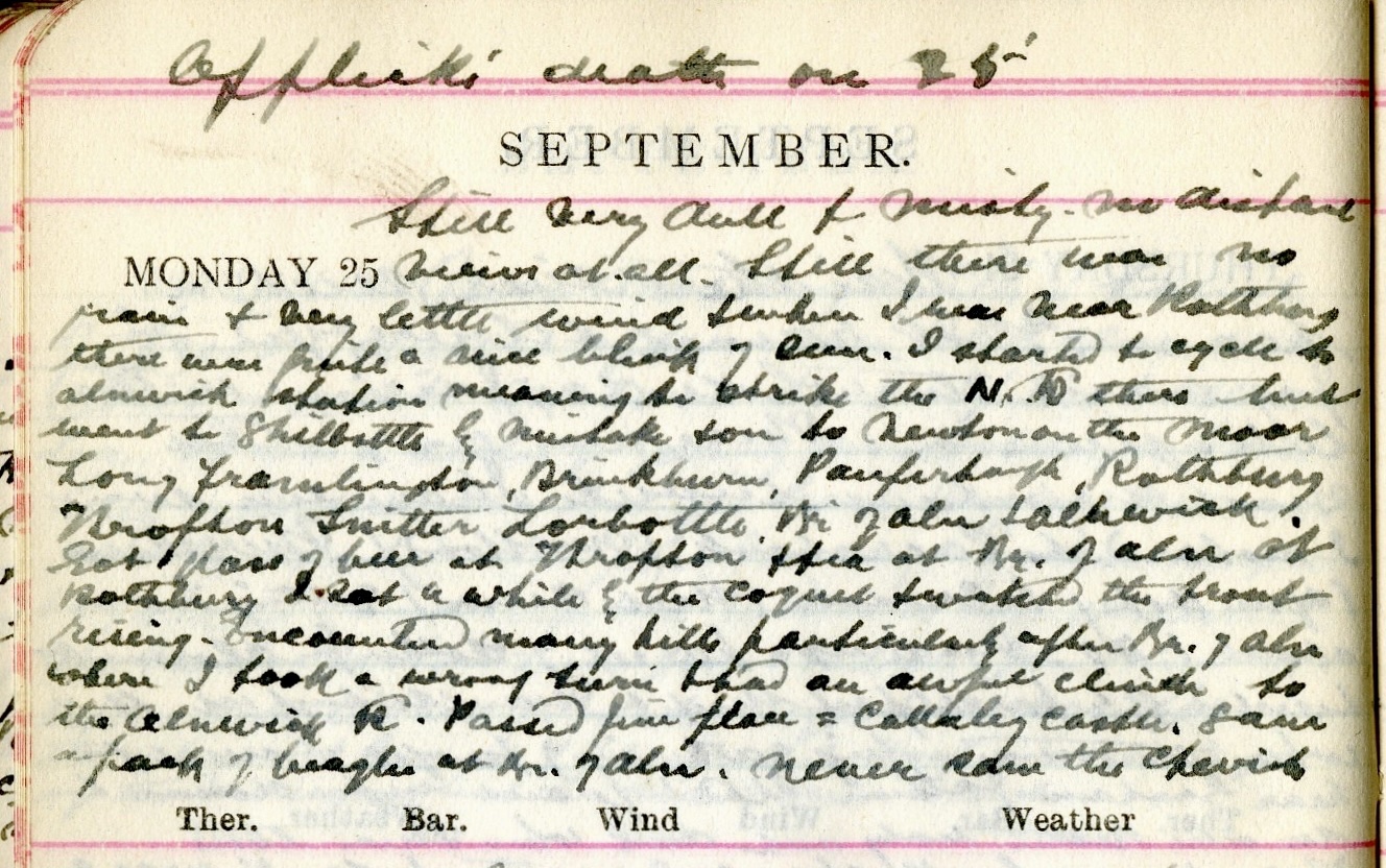 Still very dull + misty. No distant views at all. Still there was no rain + very little wind + when I was near Rothbury there was quite a nice blink of sun. I started to cycle to Alnwick Station meaning to strike the N.Rd. 2 but went to Shilbottle by mistake + on to Newton on the Moor, Longframlington, Brinkburn, Pauperhaugh, Rothbury, Thropton, Snitter, Lorbottle, Bridge of Aln and Alnwick3. Got glass of beer at Thropton + tea at the Br. of Aln4 at Rothbury. I sat a while by the Coquet + watched the trout rising. Encountered many hills particularly after Br. of Aln where I took a wrong turn + had an awful climb to the Alnwick Road. Passed fine place = Callaly Castle5. Saw a pack of beagles at Br. of Aln. Never saw the Cheviot.