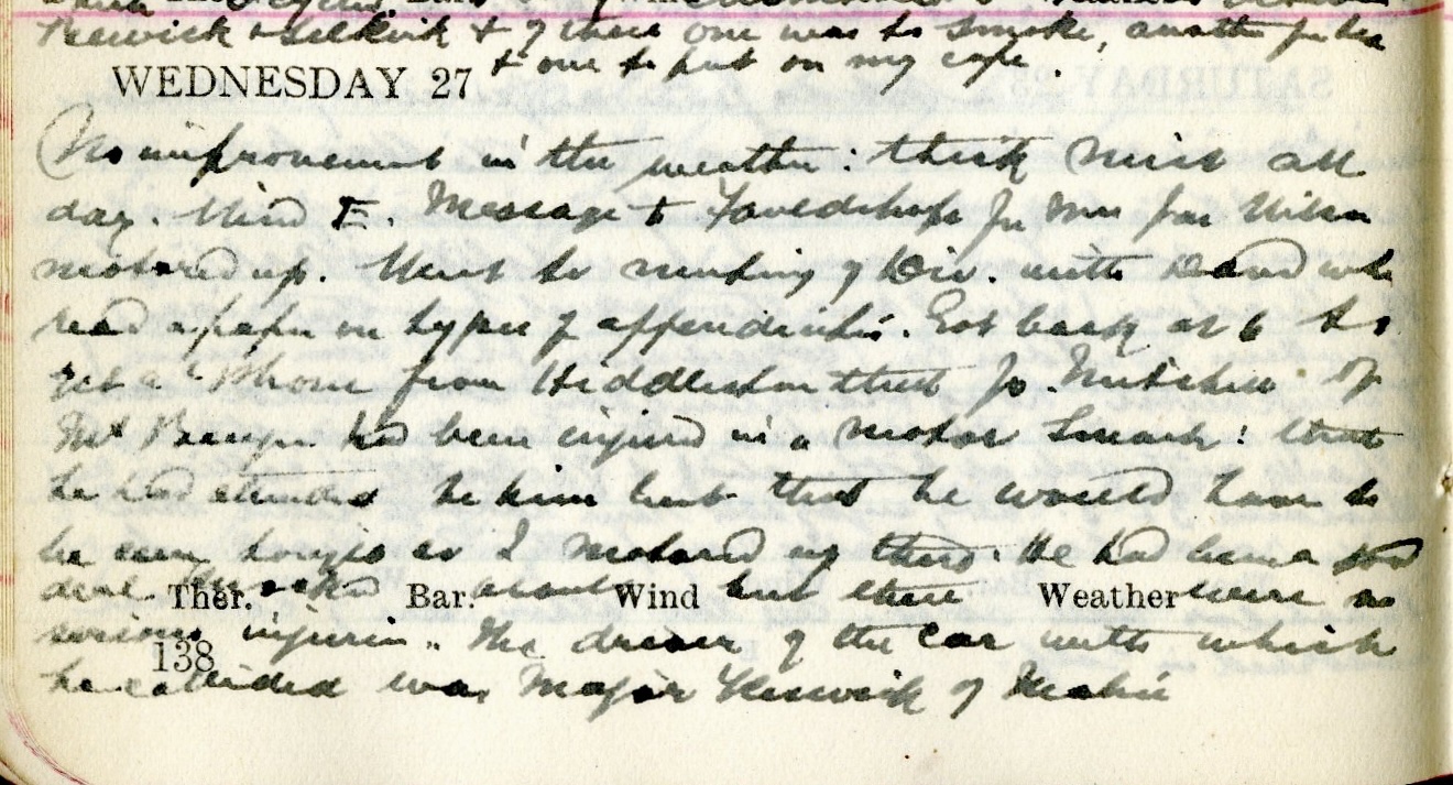 No improvement in the weather : thick mist all day. Wind E. Message to Fauldshope for Mrs Jas. Wilson1[and] motored up. Went to meeting of Division with David2 who read a paper on types of appendicitis. Got back at 6 to get a’phone from Hiddleston3 that Jo. Mitchell of Mt Benger4 had been injured in a motor smash : that he had attended to him but that he would have to be seen tonight so I motored up there. He had been a good deal knocked about but there were no serious injuries. The driver of the car with which he collided was Major Keswick of Mabie.5