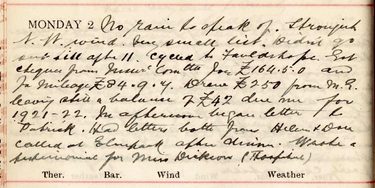 No rain to speak of. Strongish N.W. wind. Very small list. Didn’t go out after 11. Cycled to Fauldshope.1 Got cheques from Insurce Comttee for £164.5.0. and for mileage £84.9.7. Drew £250 from M.G.2 leaving still a balance of £42 due me for 1921-22. In afternoon began letter to Patrick.3 Had letters from Helen + Dora.4 Called at Elmpark5 after dinner. Wrote a testimonial for Miss Dickson (Hospital).6