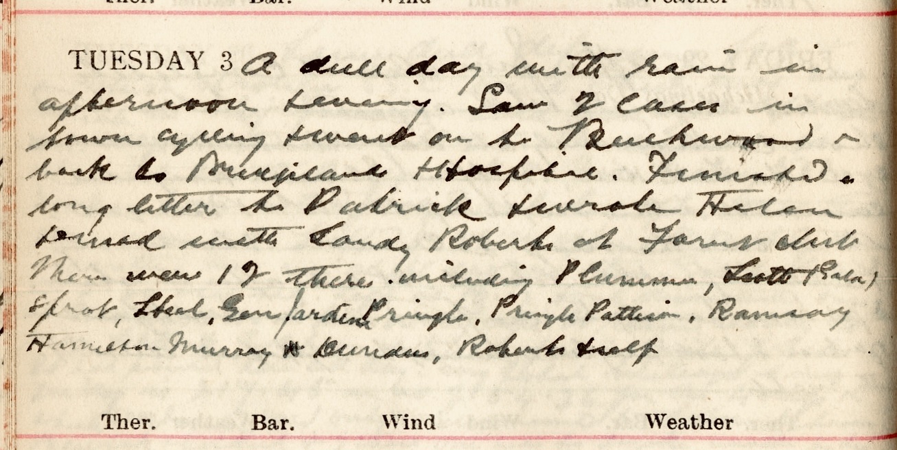 A dull day with rain in afternoon+ evening. Saw 2 cases in town cycling + went on to Beechwood, back to Bridgelands + Hospital. Finished a very long letter to Patrick1 + wrote Helen.2 Dined with Sandy Roberts3 at Forest Club.4 There were 12 there including Plummer5, Scott (Gala)6, Sprot7, Steel8, Gen. Jardine9, Pringle Pattison10, Ramsay11, Hamilton Murray12 *13 Dundas14, Roberts + self.