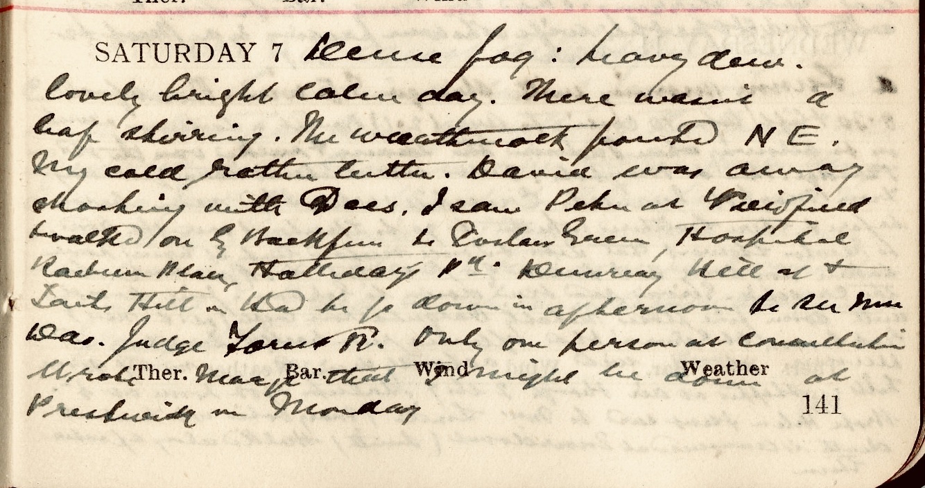 Dense fog : heavy dew. Lovely bright calm day. There wasn’t a leaf stirring. The weathercock pointed N.E. My cold rather better. David1 was away shooting with Dees.2 I saw Peter3 at Viewfield + walked on by Backfeus to Goslaw Green, Hospital, Raeburn Place, Halliday’s Park, Duncreay, Hill Street + Tait’s Hill. Had to go down in afternoon to see Mrs Dav. Judge, Forest Road.4 Only one person at Consultation. Wrote Margaret that I might be down at Prestwick on Monday.5