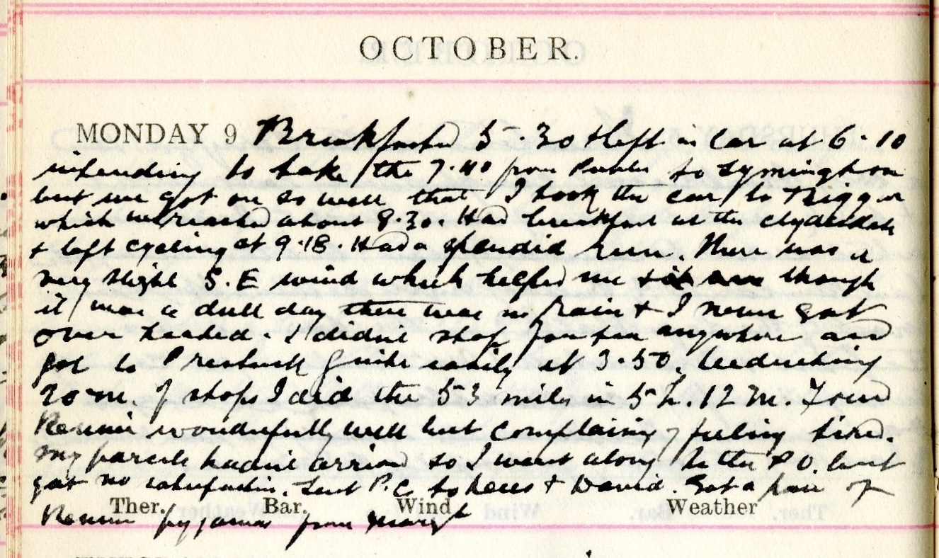 Breakfasted 5.30 + left in car at 6.10 intending to take the 7.40 from Peebles to Symington1 but we got on so well that I took the car to Biggar which we reached about 8.30. Had breakfast at the Clydesdale2 + left cycling at 9.18. Had a splendid run. There was a very slight S.E. wind which helped me + it was though it was a dull day there was no rain + I never got over heated. I didn’t stop for tea anywhere and got to Prestwick quite easily at 3.50. Including 20m [minutes] of stops I did the 53 miles in 5 hours 12 minutes. Found Rennie3 wonderfully well but complaining of feeling tired. My parcels hadn’t arrived so I went along to the P.O. but got no satisfaction.4 Sent P.C. [postcard(s)] to Dees5 + David.6 Got a pair of Rennie’s pyjamas from Margt.7