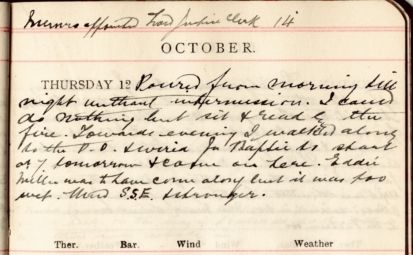 Poured from morning till night without intermission. I could do nothing but sit + read by the fire. Towards evening I walked along to the P.O. [Post Office] + wired for Baptie3 to start at 7 tomorrow + come over here. Eddie Miller4 was to have come along but it was too wet. Wind S.S.E. + stronger.
