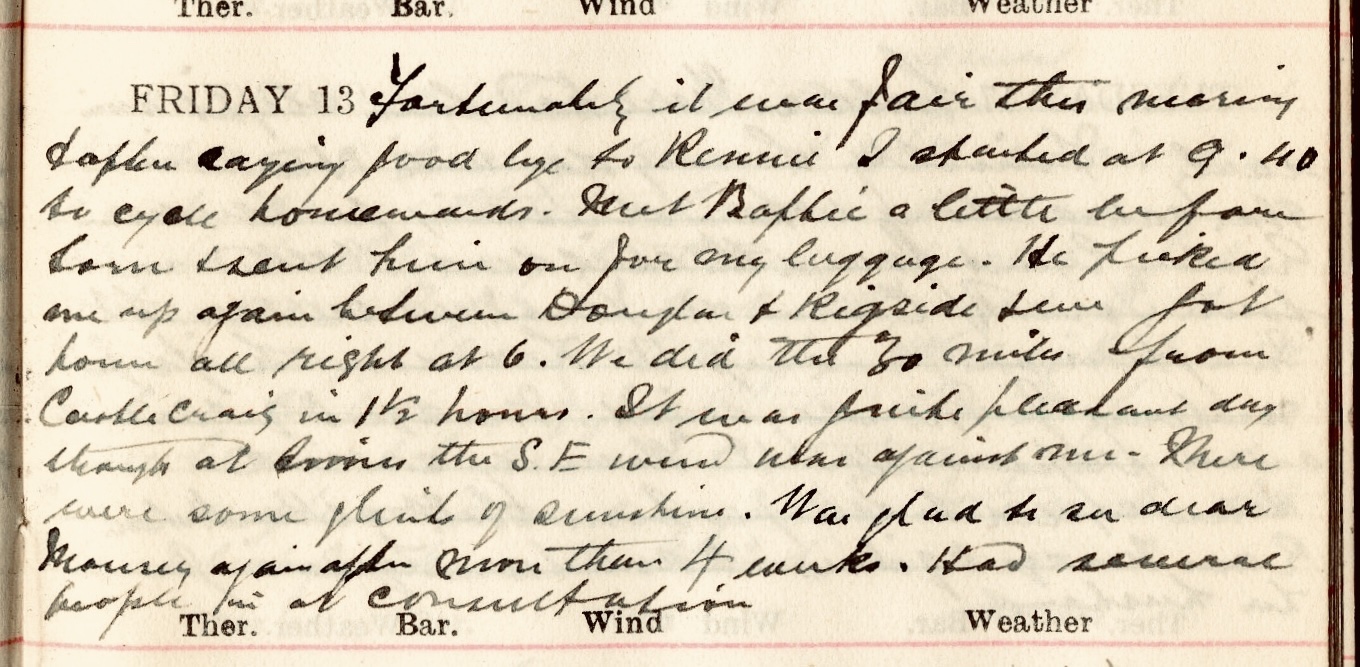 Fortunately it was fair this morning + after saying good bye to Rennie1 I started at 9.40 to cycle homewards. Met Baptie2 a little before Sorn + sent him on for my luggage. He picked me up again between Douglas + Rigside3 + we got home alright at 6. We did the 30 miles from Castle Craig in 1½ hours.4 It was quite [a] pleasant day though at times the S.E. wind was against me. There were some glints of sunshine. Was glad to see dear Mousey5 again after more than 4 weeks. Had several people in at consultation.