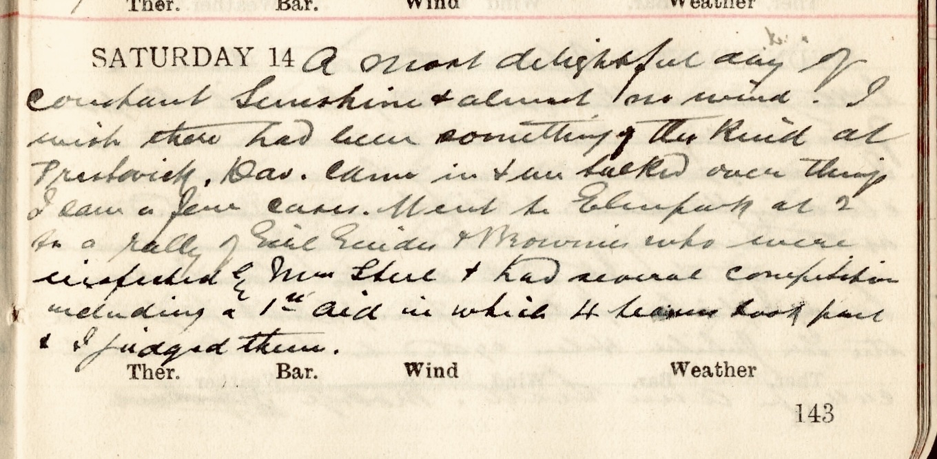 A most delightful day of constant sunshine + almost no wind. I wish there had been something of the kind at Prestwick.1 Dav.2 came in + we talked over things. I saw a few cases. Went to Elmpark3 at 2 for a rally of Girl Guides + Brownies who were inspected by Mrs Steel4 + had several competitions including a 1st Aid in which 4 teams took part + I judged them.