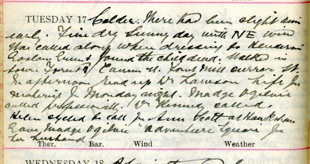 Colder. There had been slight rain early. Fine dry sunny day with N.E. wind. Was called along when dressing to Henderson, Goslaw Green + found the child dead.1 Walked in town Forest Road, Cannon Street, Forest Mill, Curror Street. In the afternoon read up Dr Lawson’s Life2 for material for Monday night.3 Madge Ogilvie4 called professionally. Dr Kennnedy5 called. Helen6 cycled to call for Ann Scott at Hawkshaw.7 Gave Madge Ogilvie “Adventure Square”8 for her husband.9