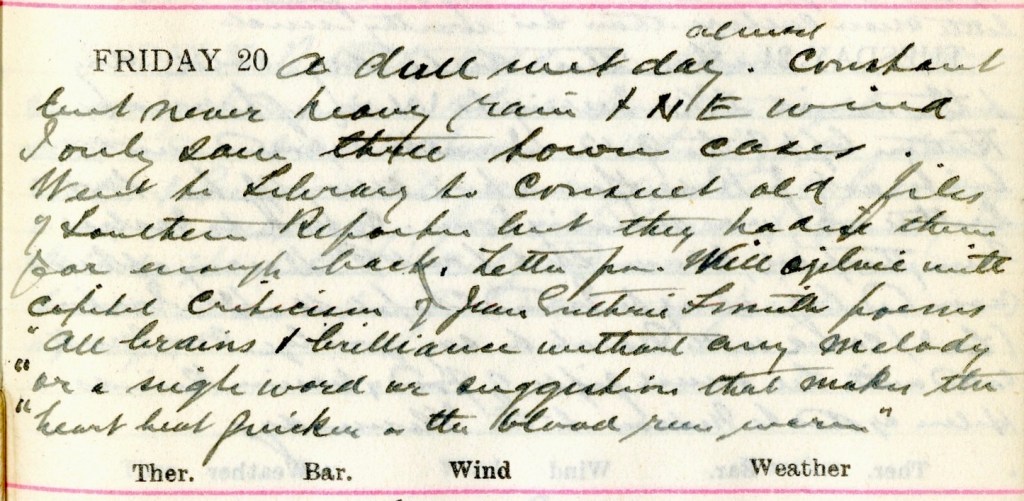 A dull wet day. Almost constant but never heavy rain + N.E. wind. Only saw three town cases. Went to Library to consult old files of Southern Reporter but they hadn’t them far enough back.1 Letter from Will Ogilvie2 with capital criticism of Jean Guthrie Smith’s poems3 “All brains + brilliance without any melody or a right word or suggestion that makes the heart beat quicker or the blood run warm.”4