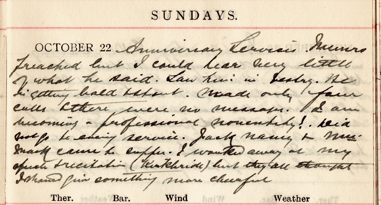 Anniversary Services.1 Munro preached but I could hear very little of what he said. Saw him in Vestry. He is getting bald + stout.2 Made only four calls + there were no messages. I am a professional nonentity!3 Did not go to evening service. Jack, Nancy4 + Mrs Mack5 came to supper. I worked away at my speech + recitation6 (Kirkbride7) but they all thought I should do something more cheerful.