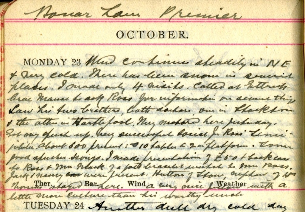 Wind continues steadily in N.E. + very cold. There has been snow in several places. I made only 4 visits. Called at Ettrickbrae Manse to ask Ross2 for information on several things.3 Saw his two brothers, both doctors, one in Stockton + the other in Hartlepool.4 They motored here yesterday. Got my speech up. Very successful Social for Ross’ Semi-Jubilee5 about 600 present6: [illegible] tables + 2 on platform. Some good speeches + songs. I made presentation of £50 + book case to Ross + Mrs Mack7 of a gold bracelet watch to Mrs Ross.8 Jack + Nancy9 were present. Hutton of Stow10, nephew of Dr Thomas11 stayed here. A very nice fellow with a little more culture than his worthy uncle.
