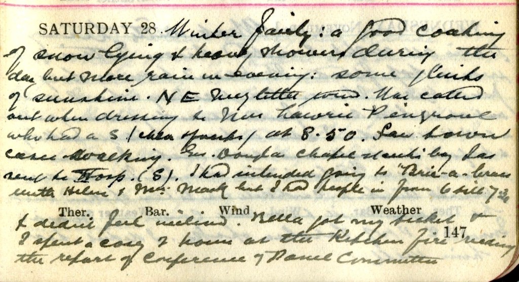 Winter fairly : a good coating of snow lying + a heavy shower during the day but more rain in evening some glints of sunshine. N.E. [but] very little wind. Was called out when dressing to Miss Lawrie, Pinegrove who had a s. (Chlor. + forceps) at 8.50.1 Saw town cases walking. Geo. Douglas, Chapel Street’s boy Jas.2 sent to Hospital (S3). I had intended going to Bric-a-brac4 with Helen5 + Mrs Mack6 but I had people in from 6 till 7.30 + didn’t feel inclined. Bella7 got my ticket + I spent a cosy 2 hours at the kitchen fire reading the report of Conference of Panel Committees.8