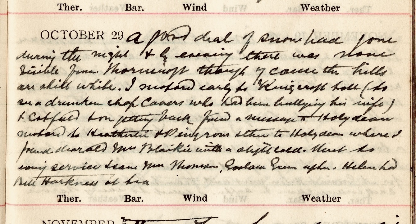 A good deal of snow had gone during the night + by evening there was none visible from Thorncroft1 though of course the hills are still white. I motored early to Kingcroft toll2 (to see a drunken chap Cavers3 who had been bullying his wife) + Cotfield4 on getting back found a message to Holydean.5 Motored to Heatherlie + Pinegrove6 + then to Holydean where I found dear old Mrs Blaikie7 with a slight cold. Went to evening service + saw Mrs Thomson8, Goslaw Green after. Helen9 had Bell Harkness at tea.10