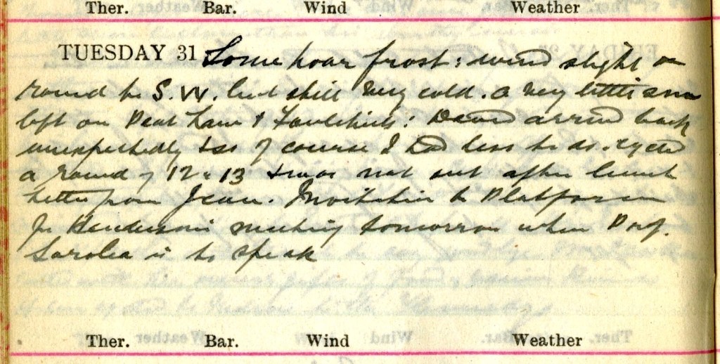 Some hoar frost + wind slight + round to S.W. but still very cold. A very little snow left on Peat Law + Foulshiels: David1 arrived back unexpectedly + so of course I had less to do. Cycled a round of 12 or 13 [cases] + was not out after lunch. Letter from Jean.2 Invitation to Platform3 for Henderson’s4 meeting tomorrow when Prof. Sarolea5 is to speak.