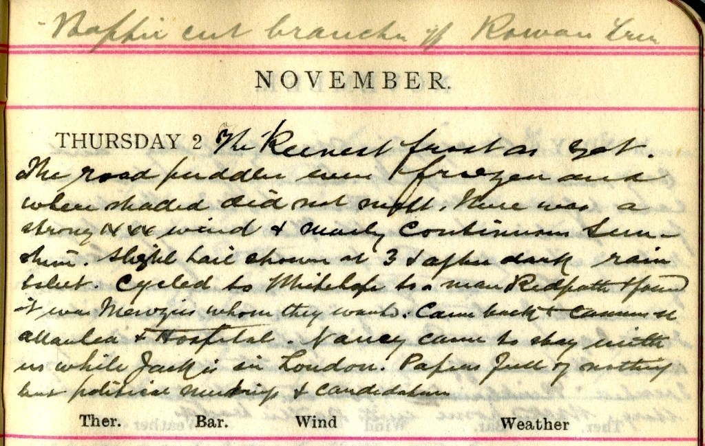 The keenest frost as yet. The road puddles were frozen and where shaded did not melt. There was a strong N.W. wind + nearly continuous sunshine. Slight hail shower at 3 + after dark rain + sleet. Cycled to Whitehope2 to a man Redpath3 + found it was Menzies4 whom they wanted. Came back to Cannon Street, Allanlea5 + Hospital. Nancy6 came to stay with us while Jack7 is in London. Papers full of nothing but political meetings + candidature.8