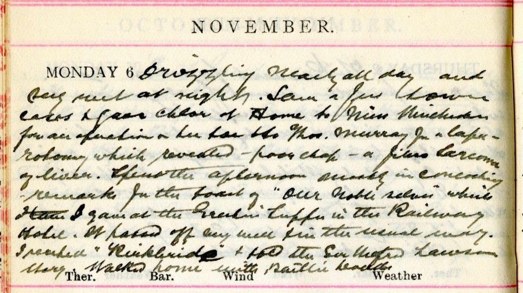 Drizzling nearly all day and very wet at night. Saw a few town cases + gave Chlor[oform] to Miss [illegible]1 for an operation on her toe + to Thos. Murray2 for a laparotomy which revealed – poor chap – a Fibro Sarcoma of liver.3 Spent the afternoon mostly in concocting remarks for the toast of “Our Noble Selves”4 which I gave at the Greetin’ Supper5 in the Railway Hotel.6 It passed off very well + in the usual way.7 I recited ‘Kirkbride’8 + told the Sir [illegible] Lawson story.9 Walked home with Baillie Dodds.10