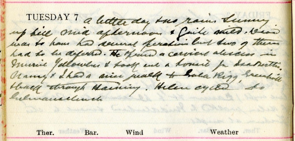 A better day + no rain. Sunny up till mid afternoon + quite mild. David1 was to have had several operations but 2 of them had to be deferred. He opened a cervical abscess in Muriel Yellowlees2 + took out a tonsil for Isa Beattie.3 Nancy4 + I had a nice walk to Gala Rigg, Greenhill + back through Haining.5 Helen6 cycled to Gilmanscleuch.7
