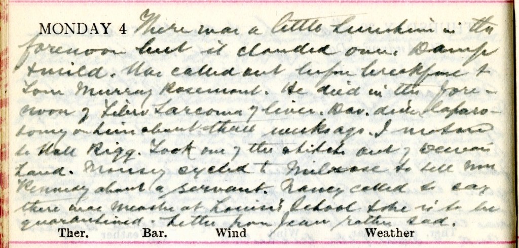 There was a little sunshine in the forenoon but it clouded over. Damp + mild. Was called out before breakfast to Tom Murray, Rosemount.1 He died in the forenoon of Fibre Sarcoma of liver. Dav.2 did laparotomy on him about three weeks ago.3 I motored to Woll Rigg. Took one of the stitches out of Dewar’s hand.4 Mousey5 cycled to Melrose to tell Mrs Kennedy6 about a servant. Nancy7 called to say there was measles at Louisa’s School + she is to be quarantined.8 Letter from Jean rather sad.9