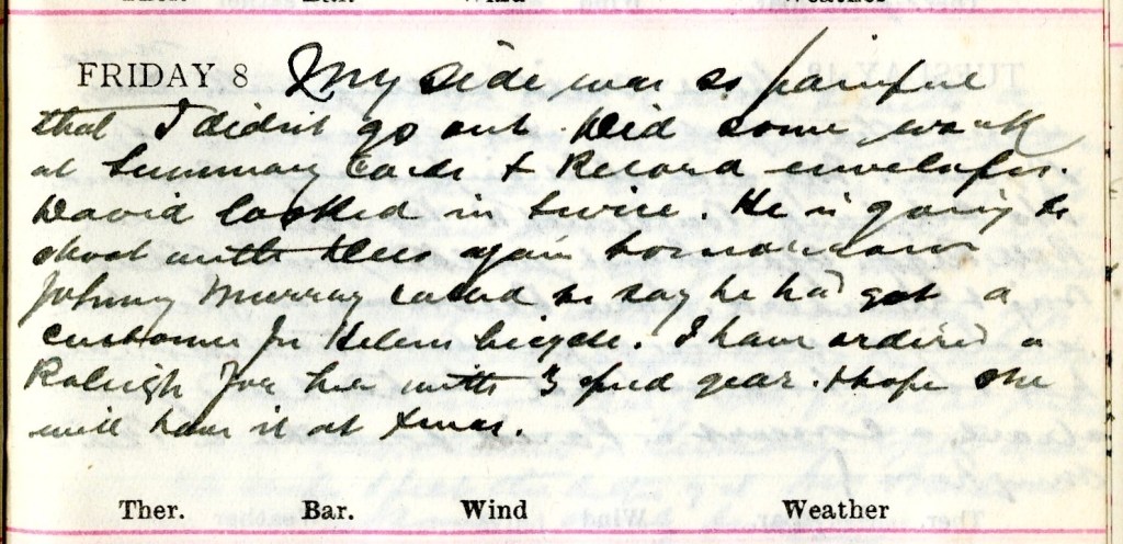 My side was so painful that I didn’t go out. Did some work on Summary Cards + Record envelopes. David1 looked in twice. He is going to shoot with Dees2 again tomorrow. Johnny Murray3 called to say he had got a customer for Helen’s bicycle.4 I have ordered a Raleigh for her with 3 speed gears. + hope she will have it at Xmas.