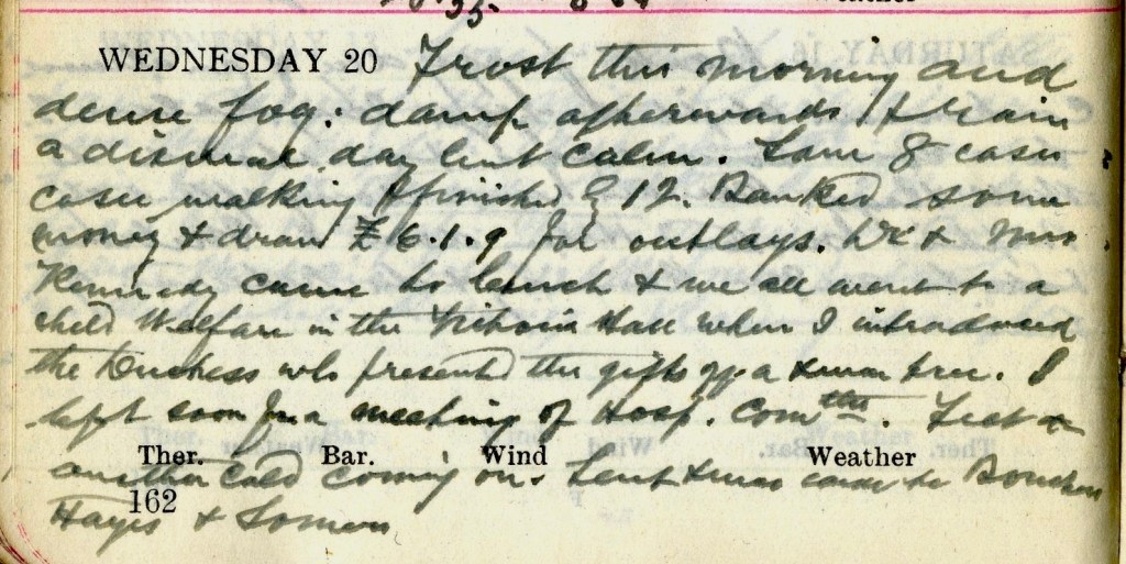 Frost this morning and dense fog : damp afterwards + rain a dismal day but calm. Saw 8 cases cases [sic] walking + finished by 12. Banked some money + drew £16. 1. 9. for outlays. Dr + Mrs Kennedy1 came to lunch + we all went to a Child Welfare in the Victoria Hall2 where I introduced the Duchess3 who presented the gifts off a Xmas tree. I left soon for a meeting of Hosp. Comttee. Felt another cold coming on. Sent Xmas cards to Boucher4, Hayes5 + Somers.6