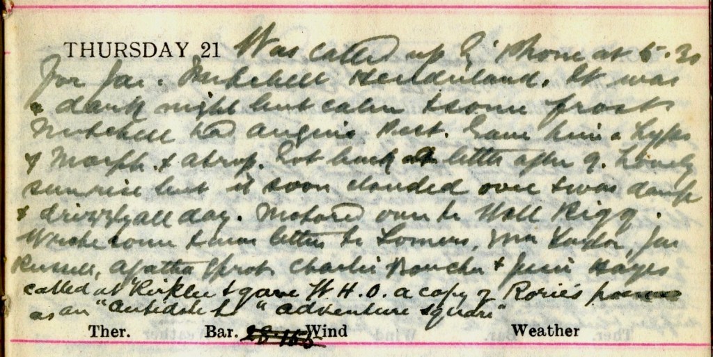 Was called up by ’Phone at 5.20 for Jas. Mitchell, Henderland.1 It was a dark night but calm + some frost. Mitchell had Angina Pect.2 Gave him a hypo of Morph + Atrop.3 Got back a little after 9. Lovely sunrise but it soon clouded over + was damp + drizzly all day. Motored over to Woll Rigg.4 Wrote some Xmas letters5 to Somers6, Mrs Taylor7, Jas. Russell8 Agatha Sprot9, Charlie Boucher10 + Jessie Hayes.11 Called at Kirklea + gave W.H.O.12 a copy of Rorie’s poems13 as an “antidote to “Adventure Square”.14