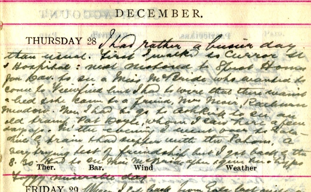 I had rather a busier day than usual. First I walked to Curror Street + Hospital: next motored to Sprot Homes1 for Dav.2 to see a Miss McBride3 who wanted to come to Viewfield but I had to wire4 that there wasn’t a bed + she came to a friend Miss Moir, Raeburn Meadow.5 Then I had to go to Ashkirk to see an old tramp Pat Doyle, whom I saw a few days ago.6 In the evening I went over to Galashiels by train + had supper with the Patons.7 A very trying test of friendship but I got back by the 8.30. Had to see Miss McBride after + give her a hypo. Foggy miserable day.