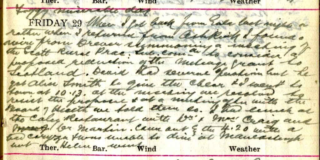 When I got back from Gala last night or rather when I returned from Ashkirk I found a wire from Drever1 summoning a meeting of the Scott. Rural Practice. Sub-Comttee to consider a proposed reduction of the mileage grant to Scotland. David2 had several operations but he got Alice Smith3 to give the Chlor[oform] + I went to town at 10.13. At the meeting we resolved to resist the proposal + at a meeting after with the Board of Health we told them so. I had lunch at the Caley Restaurant with Dr + Mrs Craig4 + [text deleted] Dr Martin [sic].5 Came out by the 4.20 with a bad coryza + was unable to dine at Mauldsheugh6 but Helen7 went.