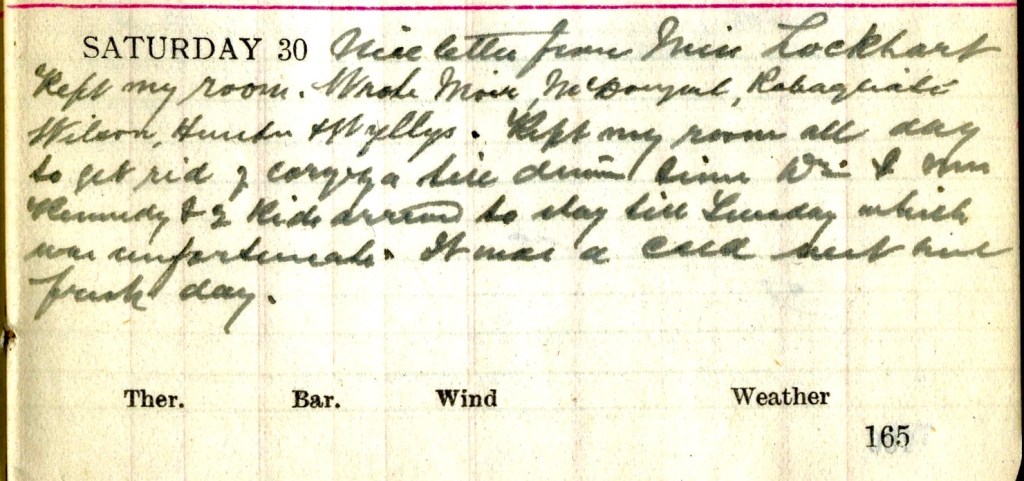 Nice letter from Miss Lockhart.1 Kept my room. Wrote Moir2, McDougal3, Rabagliati4, Wilson5, Hunter6 + Wyllys.7 Kept my room all day to get rid of coryza till dinner time. Dr + Mrs Kennedy8 + 2 kids arrived to stay till Tuesday which was unfortunate. It was a cold wet but fresh day.