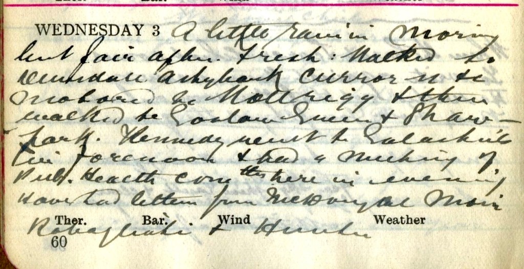 A little rain in morning but fair after. Fresh : Walked to Dunsdale, Ashybank, Curror Street +c. Motored to Woll Rigg1 + then walked to Goslaw Green + Shawpark. Kennedy2 went to Galashiels in forenoon + had a meeting of Pub. Health Comttee here in evening. Have had letters from McDougal3, Moir4, Rabagliati5 + Hunter6.