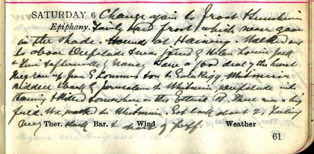 Change again to frost + sunshine. Fairly hard frost which never goes in the shade. Hounds at Haining. Walked out to above Deepslade1 + was joined by Helen2, Louise, Jock + Tim3 + afterwards by Nancy.4 Saw a good deal of the Hunt. They ran up from S Common + on to Gala Rigg, Whitmuir, Riddell + back by Jerusalem to Whitmuir, Deepslade into Haining + killed somewhere on the Ettrick Road.5 There was a big field. We walked to Whitmuir. Got back about 2. Feeling very slack + short of puff.