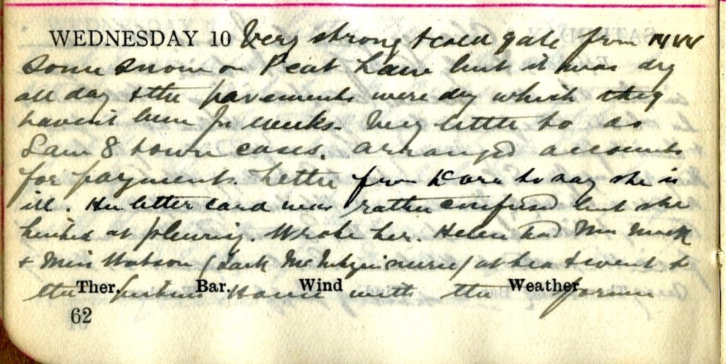 Very strong + cold gale from N.W. Some snow on Peat Law but it was dry all day + the pavements were dry which they haven’t been for weeks. Very little to do. Saw 8 town cases. Arranged accounts for payment. Letter from Dora1 to say she is ill. Her letter card was rather confused but she hinted at pleurisy. Wrote her. Helen2 had Mrs Mack3 + Miss Watson4 (Jack McIntyre’s nurse5) at tea + went to Picture House with the former.