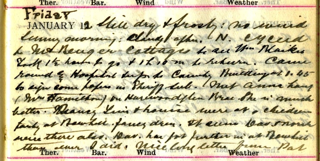 Still dry + frosty : no wind. Sunny morning : cloudy after. N. [wind] Cycled to Mt Benger Cottages to see Wm Blaikie.1 Took 1½ hours to go + 1h 10m to return. Came round by Hospital + up to County Buildings at 1.45 to sign some papers as Sheriff Sub. Met Anna Lang (Mrs Hamilton) on Harewoodglen Brae.2 She is much better. Nancy, Tim + Louise3 were at a children’s party at Bowhill fancy dress. It seems Dav. + Norah4 were there also. Dav. has got further in at Bowhill5 than ever I did. Nice long letter from Pat.6