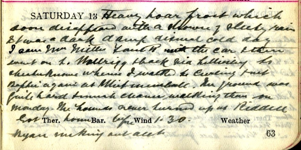 Heavy hoar frost which soon disappeared with a shower of sleety rain. It was a dark damp dismal cold day. I saw Mrs Miller, Forest Road1 with the car + then went on to Wollrigg2 + back via Lilliesleaf to Chesterknowes3 whence I walked to Curling4 + met Baptie5 again at Whitmuirhall. The ground was quite hard + much cleaner walking than on Monday. The hounds never turned up at Riddell. Got home before 1.30. Began working out accounts.