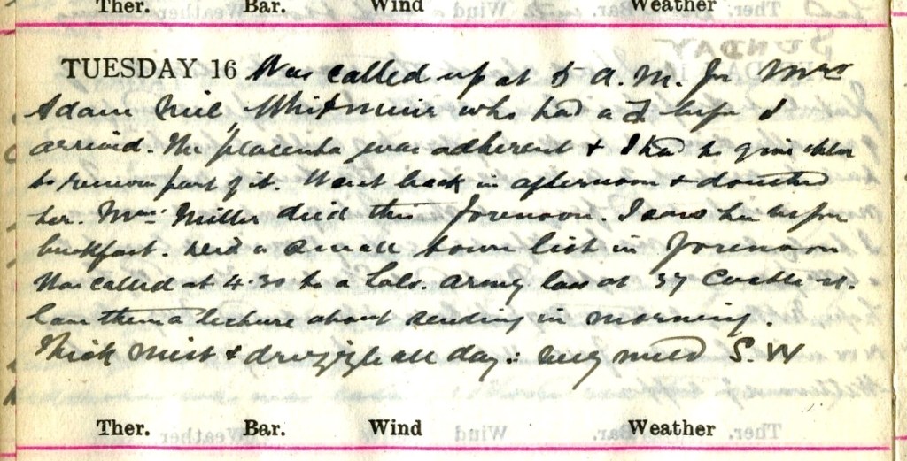 Was called up at 5 a.m. for Mrs Adam Neil, Whitmuir who had a d. [daughter] before I arrived.1 The placenta was adherent + I had to give Chlor[oform] to remove part of it. Went back in afternoon + douched her. Mrs Miller died this forenoon.2 I saw her before breakfast. Did a small town list in forenoon. Was called at 4.30 to a Salv[ation] Army. Gave them a lecture about sending in the morning.3 Thick mist + drizzle all day : very mild S.W. [wind].