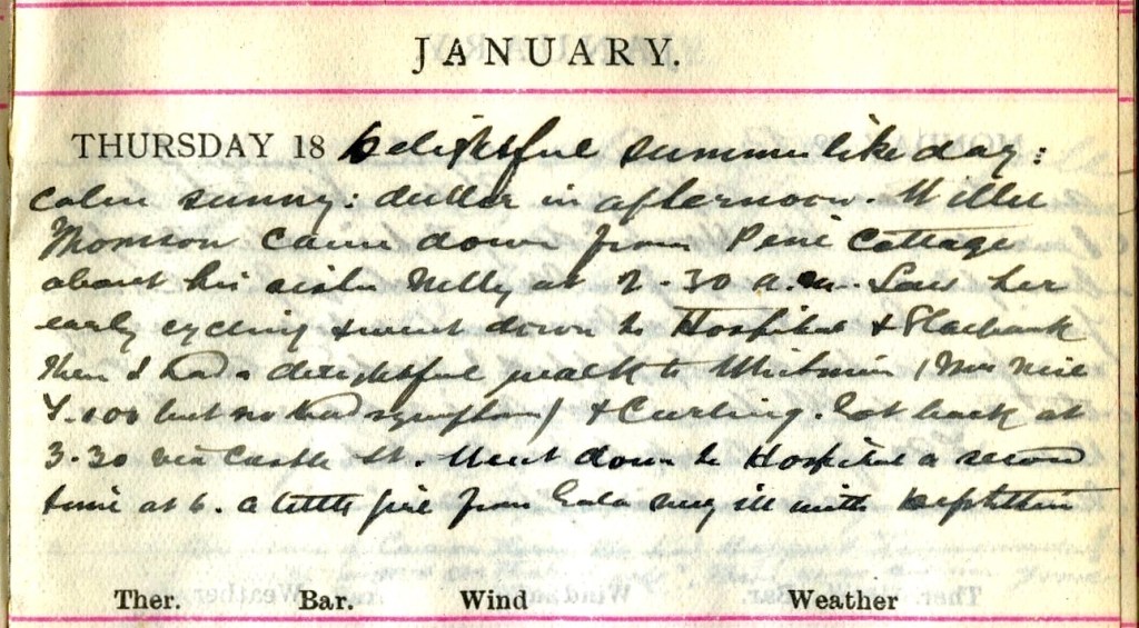 Delightful summer like day : calm sunny : duller in afternoon. Willie Thomson came down from Pine Cottage about his sister Nelly1 at 2.30 a.m. saw her early, cycling, + went down to Hospital + Sloebank.2 Then I had a delightful walk to Whitmuir (Mrs Neil T.100 but no bad symptoms3) + Curling.4 Got back at 3.20 via Castle Street. Went down to Hospital a second time at 6, a little girl from Gala Rig ill with Diphtheria.5