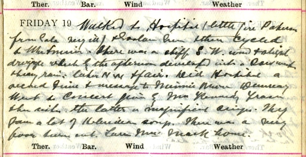 Walked to Hospital (little girl Paterson1 from Gala very ill) + Goslaw Green + then cycled to Whitmuir. There was a stiff S.W. wind + slight drizzle which by the afternoon developed into a Sou’ Wester + heavy rain, later N.W. + fair. Did Hospital a second time + message to Minnie Brown, Dunreay.2 Went to a concert by Mrs Kennedy Fraser + her sister.3 The latter a magnificent singer. They have a lot of Hebridean songs.4 There was a very poor turn out. Saw Mrs Mack home.5